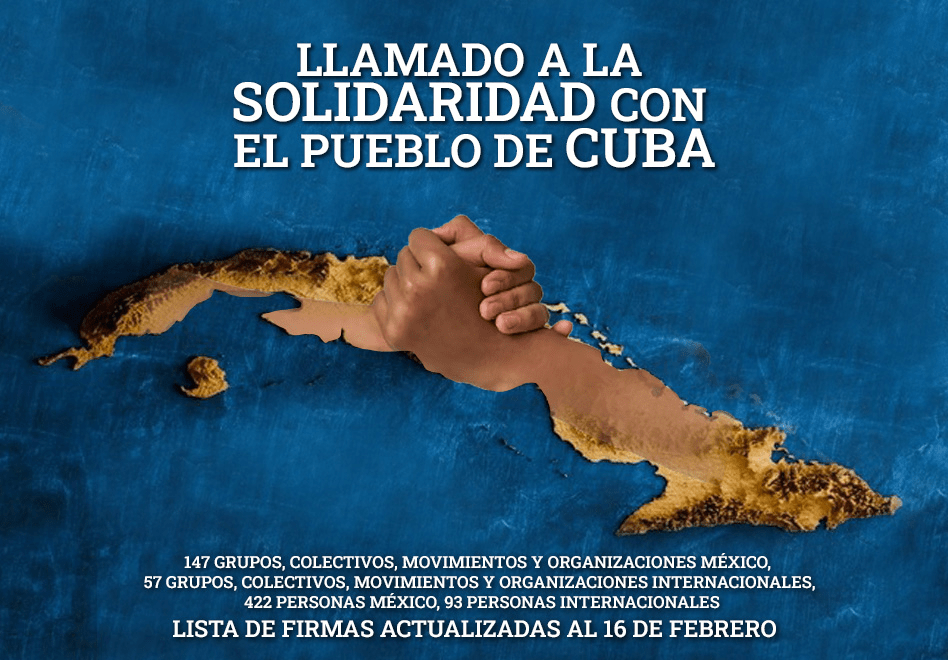 Llamado a la solidaridad con el pueblo de Cuba. Pronunciamiento de grupos, colectivos y personas, desde los distintos rincones de México y del mundo. 147 grupos, colectivos, movimientos y organizaciones México, 57 grupos, colectivos, movimientos y organizaciones internacionales, 422 personas México, 93 personas internacionales.
