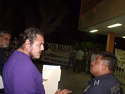 Por la tarde del lunes 17 de marzo empezaron a rondar el plantòn un grupo de personas de Comondù identificados con el equipo del gobernador electo y al fondo de la plaza un camiòn de una empresa contratada por el gobierno del estado con una serie de vallas metálicas. Horas mas tarde con una actitud provocadora, empezaron a rodear vlas casas de campaña colocando las vallas metàlicas amenazando que iniciarìan los trabajos de montaje del esecenario para la toma de poseciòn de Marcos Covarrubias. Aquí la nota elaborada por la Radio Zapatista Sudcaliforniana y la palabra de las compañeras.