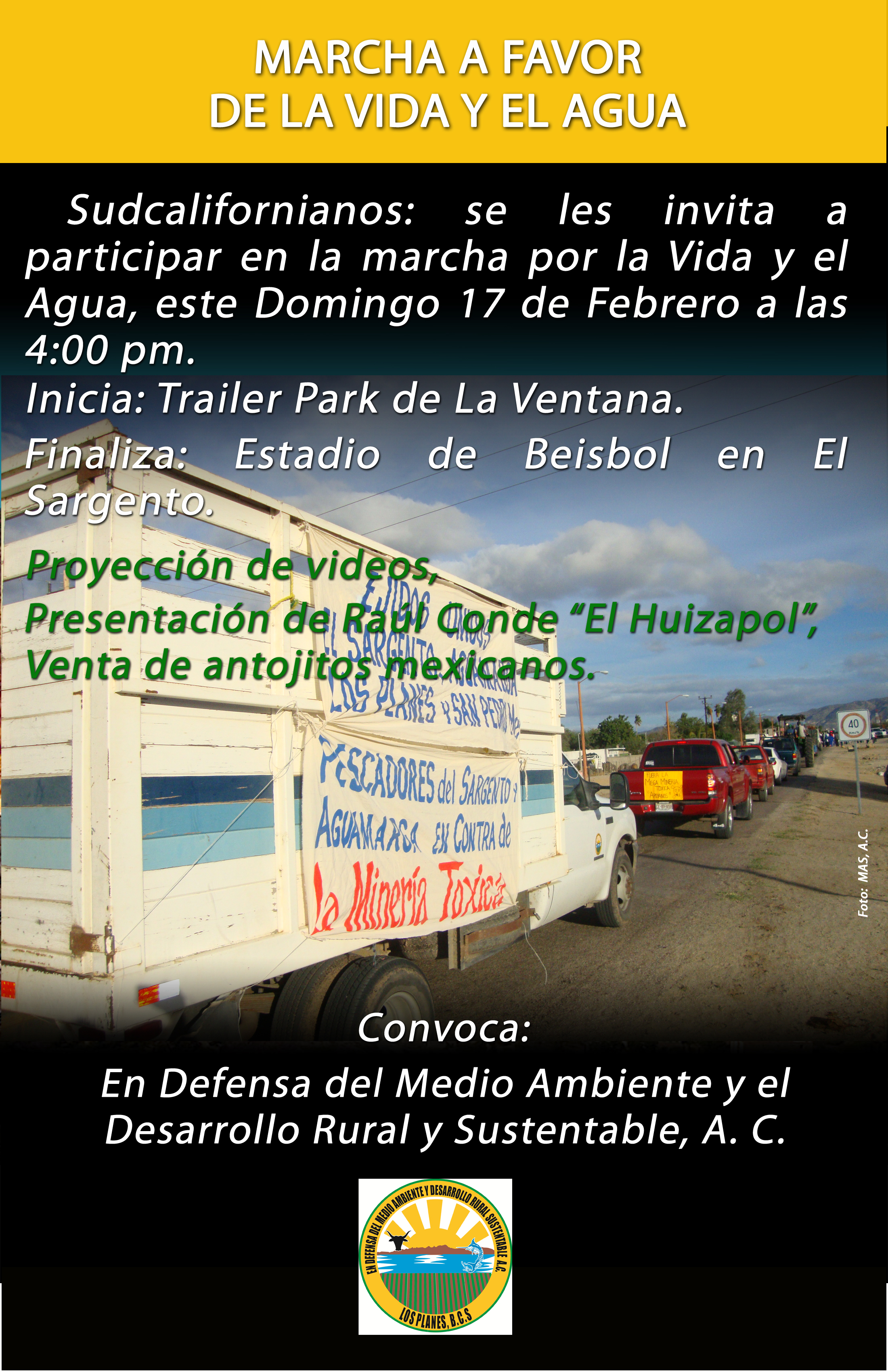 Se les invita cordialmente a la Marcha por la Vida y el Agua, convocada por la Asociación «En Defensa del Medio Ambiente y Desarrollo Rural y Sustentable A.C.» la cual se llevará a cabo este domingo 17 de febrero a las 4:00 pm, iniciando en el trailer Park de La Ventana y culminará en el Estadio de Beisbol en El Sargento.
