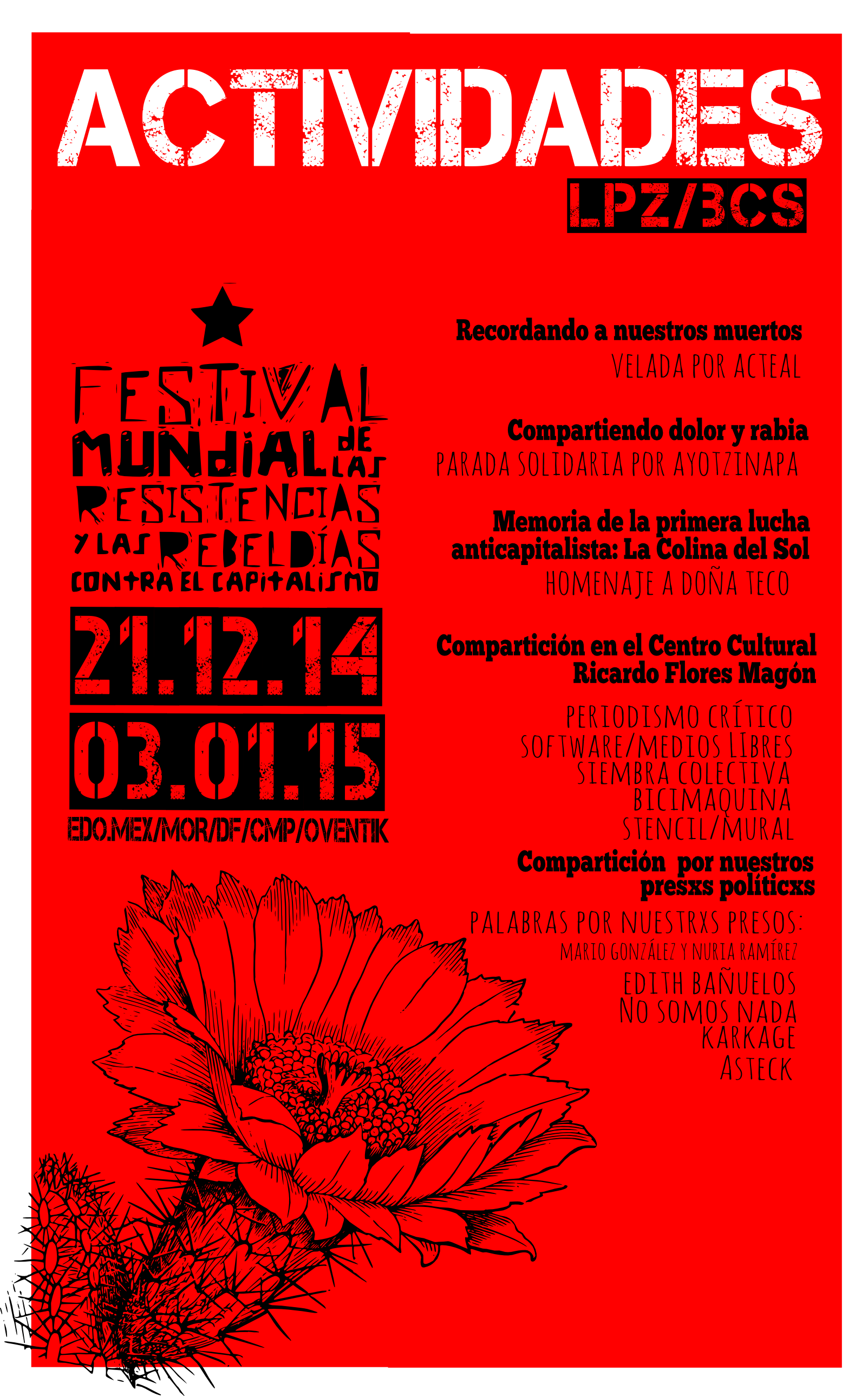 En la ciudad de La Paz haremos Eco de la compartición del Festival Mundial de las Resistencias y Rebeldías contra el Capitalismo, compartiendo palabra, pensamientos y prácticas entre individuos, individuas y colectivos, empezando el DOMINGO 21 a las 10 de la mañana donde se montará un puesto permanente para compartir información sobre AYOTZINAPA, sobre la represión del Estado, lxs presxs políticxs, resistencias y rebeldías, en el jardín Velasco. A la misma hora en el Centro Cultural Ricardo Flores Magón (Padre Kino entre Márquez y Normal, colonia los Olivos) algunos compas compartiran algunos saberes sobre tecnologías apropiadas, para construir colectivamente BiciMáquinas. El LUNES 22 se llevará a cabo una velada desde las 4 de la tarde hasta las 11 de la noche, en memoria de nuestros muertos de ACTEAL; esto será en el atrio de la catedral de nuestra señora de La Paz, donde se oficiará una misa y al mismo tiempo se proyectaran algunos videos-documentales sobre el Crimen de estado. El VIERNES 26 de 10 de la mañana a 2 de la tarde habrá una compartición sobre periodismo crítico en el Centro Cultural Ricardo Flores Magón (CCRFM), por la compa Diana Cuevas y a partir de las 5 de la tarde un festival por los presos y presas en el malecón y 5 de mayo; este festival dará inicio con un foro donde tendremos la participación de Mario González y Nuria Ramírez; posteriormente, los compas de Karkage, la compa Edith Bañuelos, los No Somos Nada y el Astek, musiqueros todxs, compartiran sus haceres. El SÁBADO 27 continuará la compartición sobre periodismo crítico de 4 de la tarde a 8 de la noche en el mismo CCRFM; pero a las 10 de la mañana lxs compas del Centro Social Otro Mundo estarán compartiendo algunas técnicas para la creación de stencil. El DOMINGO 28 se compartira la historia de la primera rebeldía y resistencia contra el capitalismo en la Paz a las 10 de la mañana en la colonia Colina del Sol en calle Francisco King entre Serdán y Guillermo Prieto. El MARTES 30 de 4 de la tarde a 8 de la noche será la compartición sobre Medios Libres en el CCRFM y el SÁBADO 3 de enero una compartición sobre SoftWare Libre para una sociedad libre, de 10 de la mañana a 2 de la tarde, impulsado por Cristian «El Tiburon» Moreno-Meza Chavez.