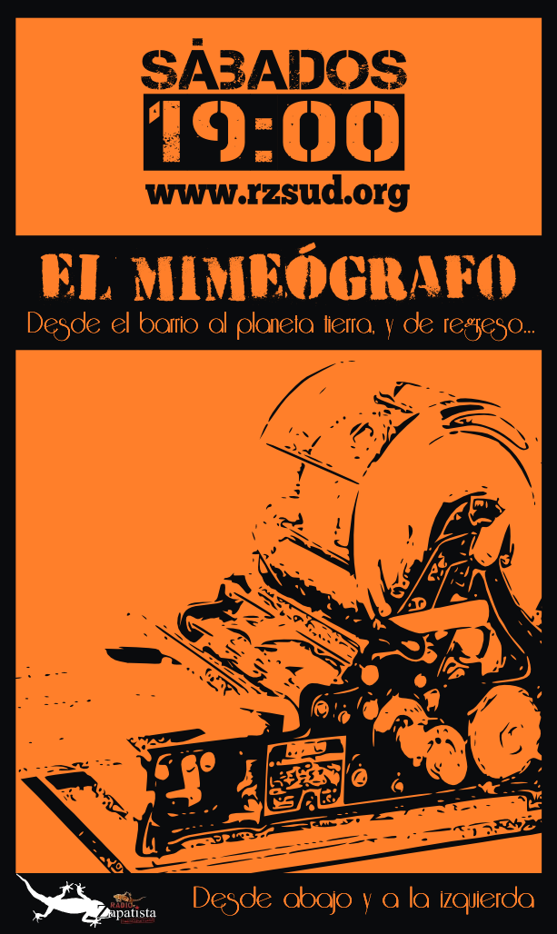 Si esto es así, emulamos en un medio electrónico, libre o como se llame, como Radio Zapatista Sudcaliforniana, la locomotora de la difusión de los movimientos sociales de las décadas anteriores a la Internet, que es EL MIMEOGRAFO, que fue el instrumento de impresión de volantes de los movimientos sociales en Baja california Sur, en México y en el mundo DESDE EL BARRIO AL PLANETA TIERRA Y DE REGRESO.