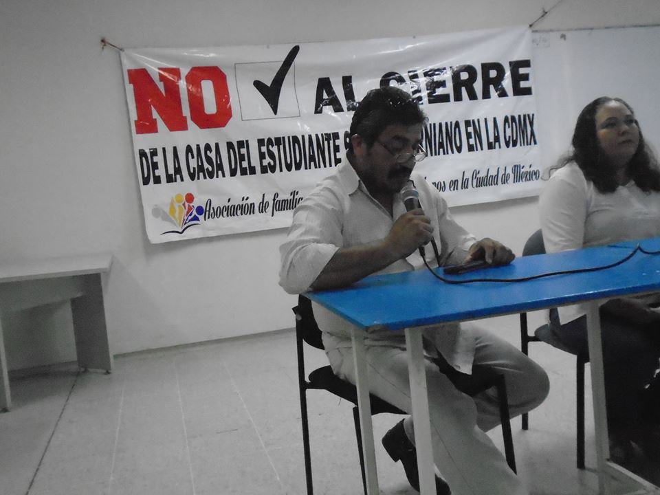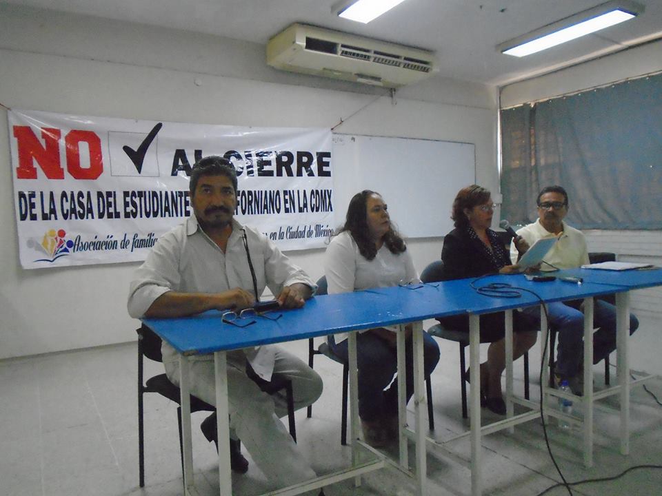 Los representantes de la Asociación de Familias de Estudiantes Sudcalifornianos en la Ciudad de México durante la conferencia de prensa realizada este jueves 20 de octubre en el aula A de la Preparatoria Morelos, anunciaron dos acciones para exigir al gobernador Carlos Mendoza Davis ¡NO al cierre de la casa del Estudiante!
