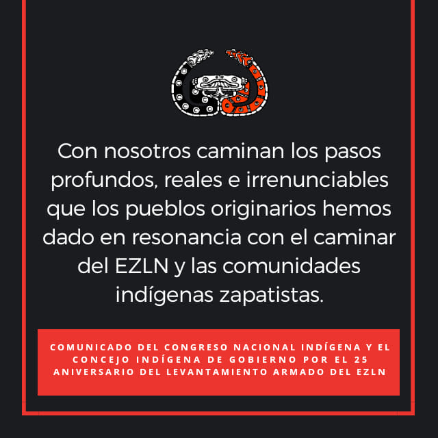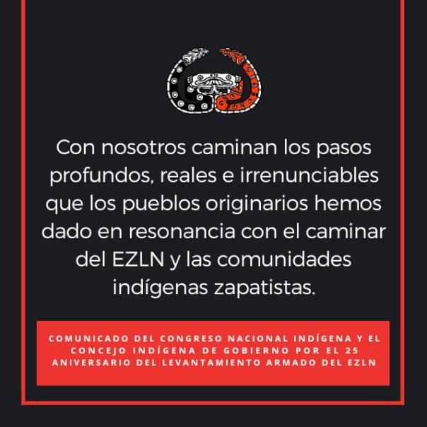 Los pueblos, naciones y tribus que conformamos el Congreso Nacional Indígena y el Concejo Indígena de Gobierno, saludamos con orgullo el 25 aniversario del levantamiento armado del Ejército Zapatista de Liberación Nacional, desde que el 1 de enero de 1994 nuestra palabra dejó de pedir limosnas para exigir justicia, y para reconocernos en los derechos que desde ese día comenzamos a ejercer, no solo en Chiapas, sino en todos los rincones indígenas de nuestro país.