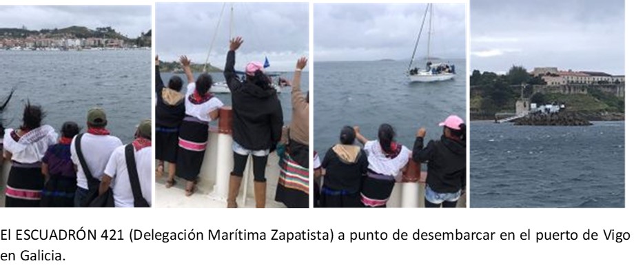 La primera de las delegaciones estuvo formada por cuatro mujeres, dos hombres y unoa otroa, llamado ESCUADRÓN 421 (Delegación Marítima Zapatista) que viajaría a bordo de “LA MONTAÑA”: Lupita. 19 años. Mexicana de nacimiento. Tzotzil de los Altos de Chiapas. Habla su lengua natal, el tzotzil, y la castilla con fluidez. Sabe leer y escribir. Ha sido coordinadora local de jóvenes, coordinadora regional de jóvenes, y administradora local de trabajo colectivo; Carolina. 26 años. Mexicana de nacimiento. Originaria tzotzil de los Altos de Chiapas, ahora Tzeltal de la selva Lacandona. Habla su lengua natal, el tzotzil, además del tzeltal y la castilla con fluidez. Sabe leer y escribir. Madre soltera de una niña de 6 años; Ximena. 25 años. Mexicana de nacimiento. Cho´ol del norte de Chiapas. Habla su lengua natal, el cho´ol, y la castilla con fluidez. Sabe leer y escribir. Madre soltera de una niña de 6 años; Yuli. 37 años. Cumplirá 38 años, en mayo, en altamar. Originaria Tojolabal de Selva fronteriza, ahora Tzeltal de la selva Lacandona. Habla la castilla con fluidez. Sabe leer y escribir. Madre de dos criaturas: una niña de 12 años y un niño de 6 años; Bernal. 57 años. Tojolabal de la zona selva fronteriza. Habla su lengua natal, el tojolabal, y la castilla con fluidez. Sabe leer y escribir. Padre de 11 hij@s: el más grande de 30 años y la más pequeña de 6; Darío. 47 años. Cho´ol del norte de Chiapas. Habla su lengua natal, cho´ol, y la castilla con fluidez. Sabe leer y escribir. Padre de 3 hij@s: uno de 22 años, otro de 9 años y la menor de 3 años; y Marijose. 39 años. Tojolabal de la zona selva fronteriza. Habla la castilla con fluidez. Sabe leer y escribir. Ha sido milicianoa, promotoroa de salud, promotoroa de educación, y formadoroa de educación.