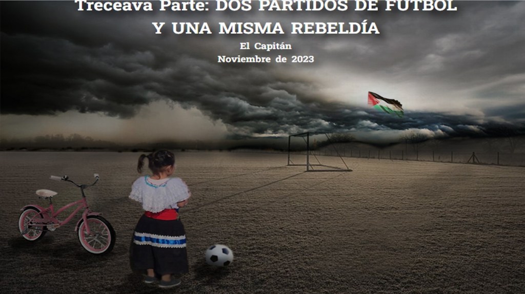 Siguiendo la antigua y probada regla zapatista de “No juegues con las reglas del enemigo”, el Sup desarrolló una especie de mezcla de rugby, con dramaturgia decimonónica, con algo de Anime, con cine muy a lo Hollywood esquina con Cannes, con el impresionismo de Monet, una pizca de Allan Poe cruce con Conan Doyle, algo de la épica de Cervantes, la brevedad de Joyce, la perspectiva de Buñuel, una pizca de Brecht mezclado con Beckett, la sazón de unos tacos al pastor, una cumbia así muy rebajada -raspadita pues-, la Anita Tijoux y la Shadia Mansour rompiendo fronteras -Palestina libre-, y, bueno, no tomé el apunte de todo, pero ya sólo faltaba el balón.