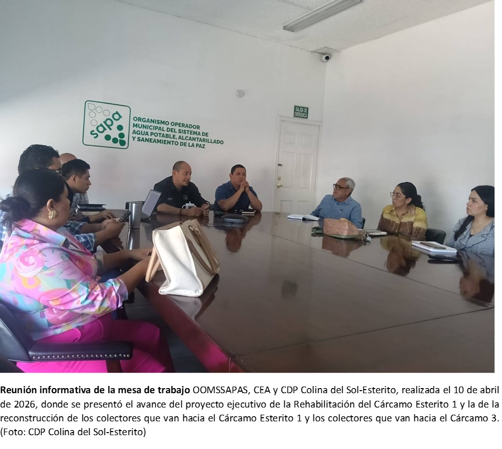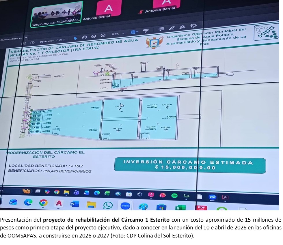 “El viernes 10 de abril, representantes de la coordinación del Comité de Defensa Popular (CDP) Colina del Sol-Esterito, acompañados de nuestro asesor técnico voluntario, acudimos a la convocatoria del Director del Organismo Operador Municipal de Agua Potable, Alcantarillado y Saneamiento de La paz (OOMSAPAS) a una reunión informativa sobre los avances en la elaboración de los proyectos ejecutivos de la modernización del Cárcamo y de la reposición de los colectores, en la que se concibe una estimación los próximos 40 años de servicio.