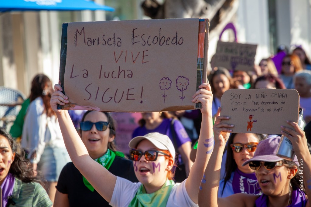 Hoy salimos a las calles para que sepan que aquí seguimos; que las mujeres seguimos en lucha, para acompañarnos en la rabía y para festejar que nos tenemos las unas a las otras; para ser la voz de las que ya no están y de las que vienen y que merecen un futuro sin miedo. Ese es el futuro que estamos construyendo y esa es nuestra promesa para ellas.