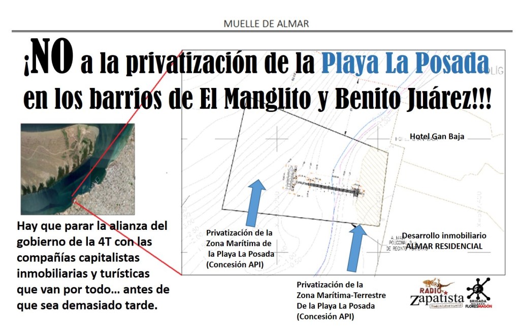 Vecinos y vecinas de la colonia Benito Juárez convocaron por las redes sociales a una primera concentración en la PLAYA LA POSADA donde el grupo de ALMAR RESIDENCIAL pretende construir un muelle de uso turístico y ocupar la zona marítima y marítimo-terrestre y despojar a los paceños y aceñas de un playa que es libremente ocupada y que históricamente ha sido parte de la vida pesquera de las colonias de El Manglito y de Inalámbrica.