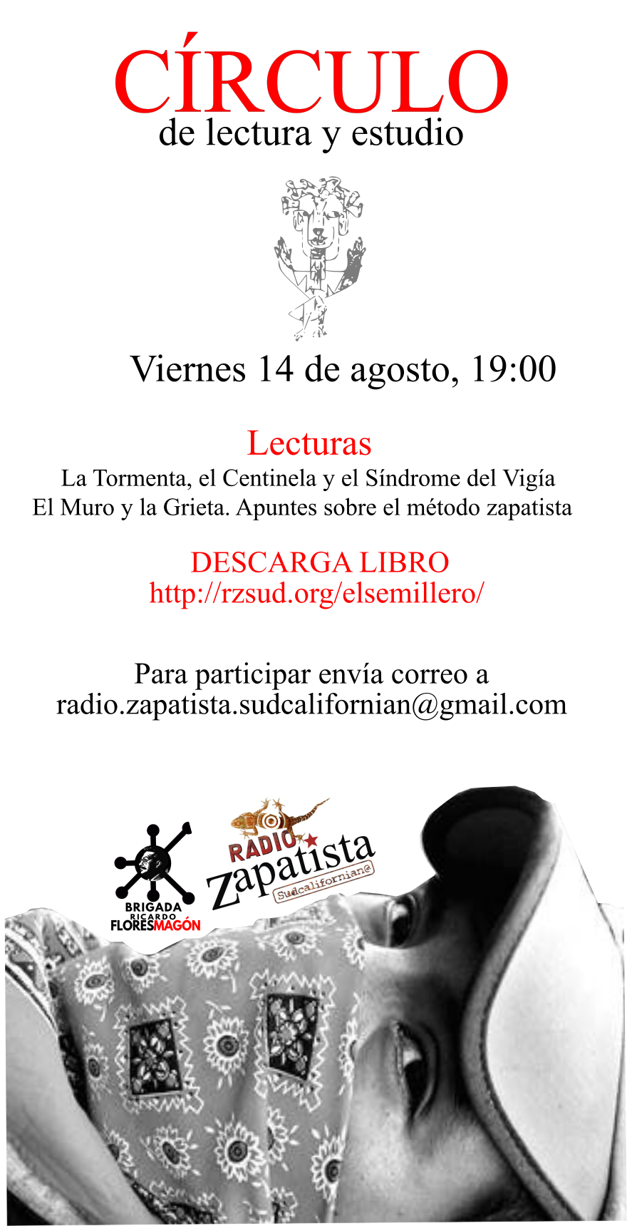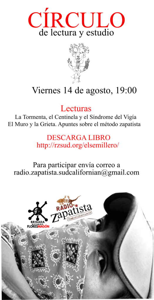 Si gusta participar en la discusión colectiva puede enviar un correo a radio.zapatista.sudcalifornian@gmail.com solicitando la liga para su participación. O bien puede seguir la conversación en vivo por la página del Centro Cultural Ricardo Flores Magón