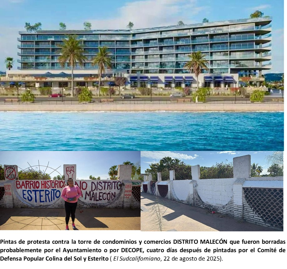 Esto no lo habían dicho al público, porque seguramente fue un negociación subterránea entre el Ayuntamiento de La Paz, un Ejido y la influyente compañía capitalista local del grupo DECOPE que además de ser constructora, parece que ahora también incursiona en la hotelería y el turismo. Tengo la impresión que la presidenta municipal se vio obligada a hacerlo público porque los medios de comunicación ejercieron presión haciendo eco de la protesta que ha hecho una parte de la población que vive en la colonia COLINA DEL SOL y en el barrio EL ESTERITO, principalmente el Comité de Defensa Popular (CDP) quienes denunciaron los altos consumos de agua potable y descarga de aguas residuales que tendría el DISTRITO MAELCON que se sumaría al consumo del hotel HBlue y las torres de condominio que están en lo alto de los cerros de la Colina del Sol y Palmira, y los que quieren hacer la familia Forcada frente a la calle NORTE en la falda sur del cerro de la Colina del Sol (Con razón el Ayuntamiento ordenó, presumiblemente, la borra de las pintas de protesta que se hicieron la barda del predio donde quieren construir la torre comercial y de condóminos, DISTRITO MALECÓN).