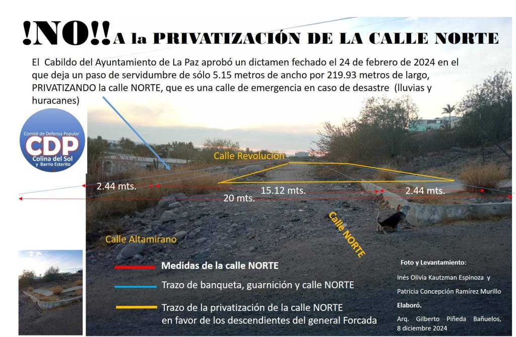 Una calle es pública, y es de todos y todas. La calle NORTE ¡SI EXISTE!!. Cruce usted el arroyo Norte, suba a las esquinas de la calle Altamirano y la calle NORTE, y ahí encontrara una calle de 20 metros de ancho de manzana a manzana con sus banquetas y guarniciones, ¡AHÍ ESTÁ!!, también están las escrituras de los vecinos y vecinas de la colonia COLINA DEL SOL, y está el acuerdo del 12 de marzo de 1973, donde se reconoce la existencia de las manzanas con su colindancia al Norte con la calle NORTE; pero además es ya una práctica desde hace medio siglo que la calle se utiliza como vialidad de emergencia, entonces, hay que preguntarse: ¿POR QUÉ EL GOBIERNO MUNICIPAL DESCONOCE LA EXISTENCIA DE LA CALLE NORTE Y LA DEJA EN MANOS DE LOS DESDENDIENTES DEL GENERAL FORCADA?. Pudiera haber varias respuestas: la primera es que hay contubernio entre algunos funcionarios del ayuntamiento y los descendientes del general Forcada; la segunda que tanto el Cabildo, la presidenta municipal y los urbanistas consideran que es más importante fomentar el desarrollismo inmobiliario y turístico de alto impacto que la emergencia de una vialidad como la calle NORTE; la tercera, no existe interés entre los funcionarios y el gobierno municipal tener a la Historia como fundamento para mantener la traza urbana original de la Calle NORTE; y la cuarta es que el gobierno municipal de La Paz tiene más oídos para la iniciativa privada que para la población residente y por lo tanto en la práctica invierten sus propias palabras (“Por el bien de todos, primero los ricos”)