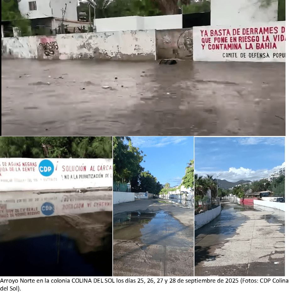 Para que usted tenga una idea de las veces en el año se ha utilizado la calle NORTE como vialidad de emergencia a causa de los derrames aguas negras, agua potable y lluvias, pongo un ejemplo con datos oficiales: OOMSAPAS LA PAZ ha informado al Comité de Defensa Popular Colina del Sol y Esterito en su diagnóstico de descargas al CÁRCAMO 1 ESTERITO, que en los últimos 7 años, ha habido 290 quejas, es decir un promedio de 41 quejas al año; si el derrame dura en promedio 5 días (pueden ser 3 o 7 días por derrame, nunca es un día), tenemos entonces que durante 205 días al año se tiene que utilizar la calle NORTE como vialidad de emergencia, ya que todos los derrames, vengan de donde vengan (Esterito, Pedregal del Cortes, Ciudad del Cielo, Olachea, Navarro Rubio, Colina de la Cruz, El Choyal) van a dar al puente de El Molinito pasando por el arroyo NORTE a lo largo de la colonia COLINA DEL SOL, que al final es la más afectada. Esa es la razón de por qué los vecinas y vecinos han reactivado el antiguo COMITÉ DE DEFENSA POPULAR COLINA DEL SOL, el que viene de las luchas del movimiento urbano popular de 1972 y de 1983, independiente del gobierno y de los partidos políticos, autónomo y autogestivo.